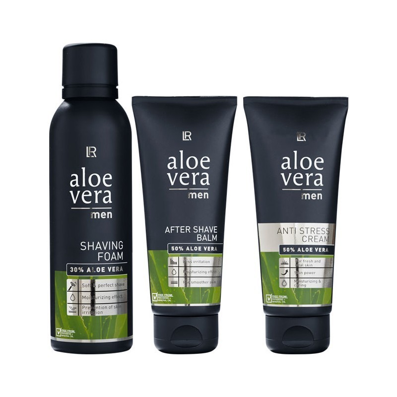 Composto da: Aloe Vera schiuma da barba (200 ml), Aloe Vera balsamo dopo barba (100 ml), Aloe Vera crema anti-stress (100 ml).