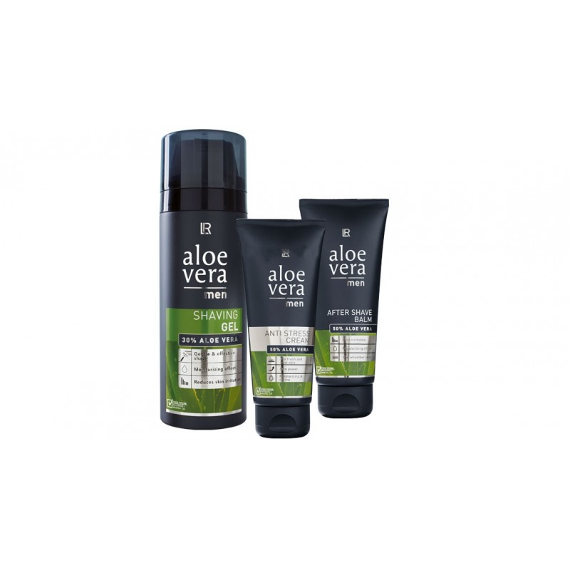 Composto da: Aloe Vera gel per la rasatura (150 ml), Aloe Vera balsamo dopo barba (100 ml), Aloe Vera crema anti-stress (100 ml).